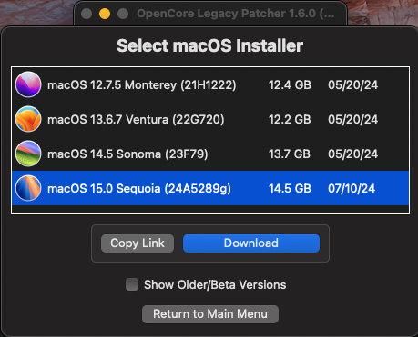 • Du musste den von griven verlinkten OCLP Nithtly nehmen, frühere Versionen haben auch die Versionsnummer 1.6.0 aber zeigten auch bei mir diese Meldung.