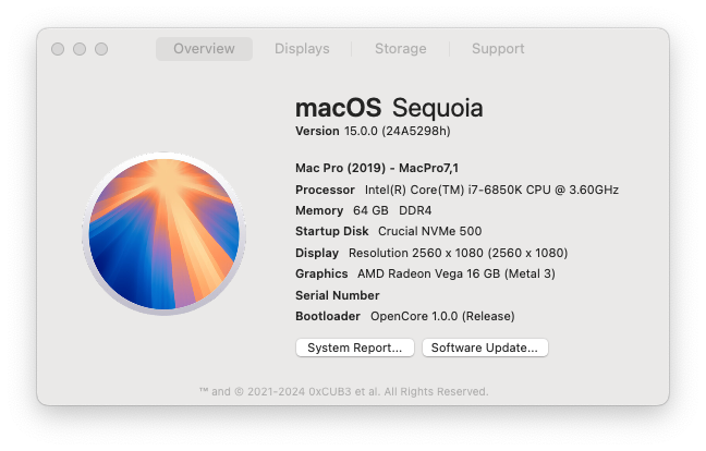 MacPro7,1: MSI Z590-A PRO | i5-11400 @ 2,60 GHz | 64 GB DDR4 | AMD Radeon RX 6600 XT 8 GB | WD Black SN850 NVMe 1 TB + Crucial CT1000MX500SSD1 SSD 1 TB + Crucial CT500MX500SSD1 SSD 500 GB | macOS Sequoia 15.7.6 (24G707) | OpenCore 1.0.7
