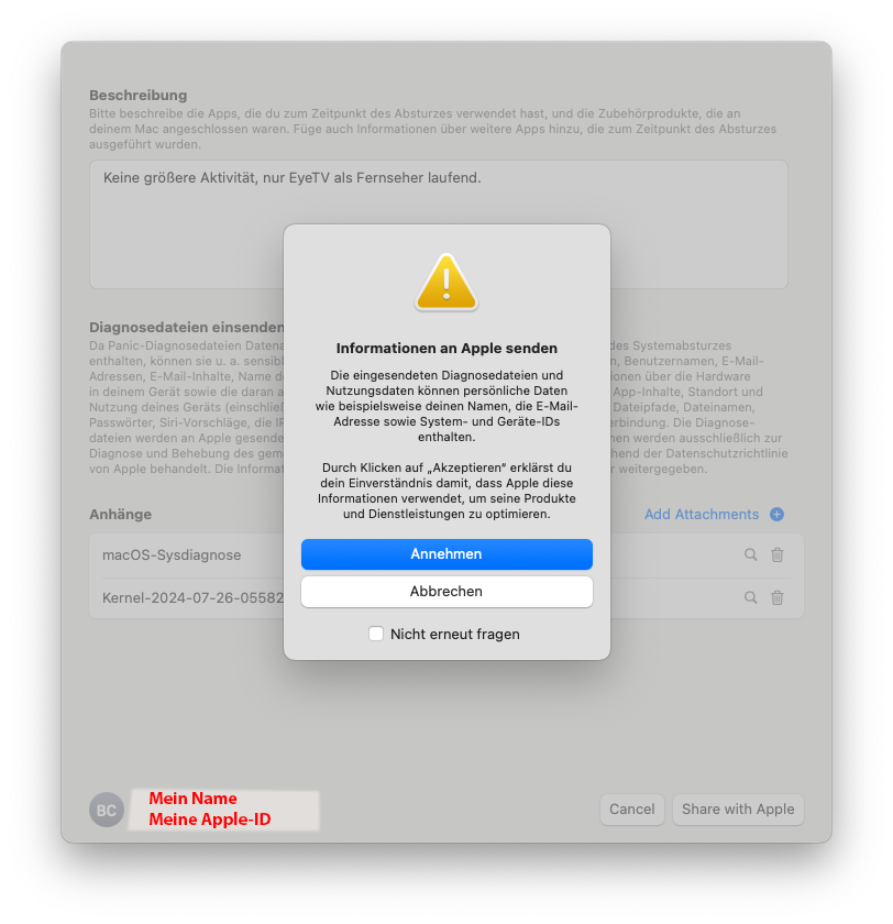 Mit jeder Fehlermeldung werden jetzt Apple-ID und Rechner-Nummer und -Art mit verschickt, nicht mehr eine eigens generierte UUID.
