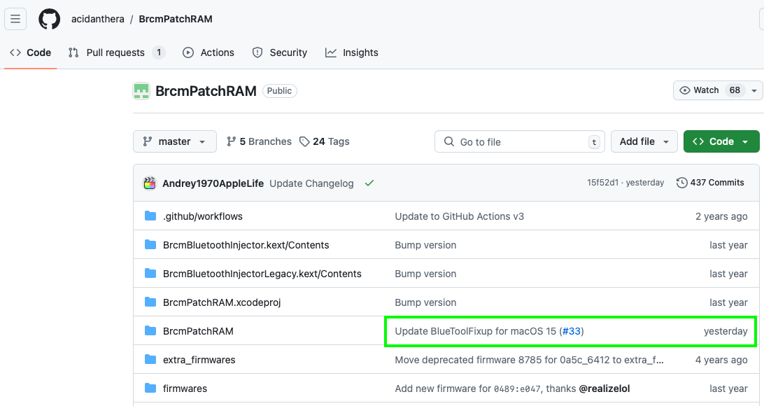 Es ist nun eine macOS 15 kompatible Version vom BlueToolFixup im BrcmPatchRAM Repository verfügbar: