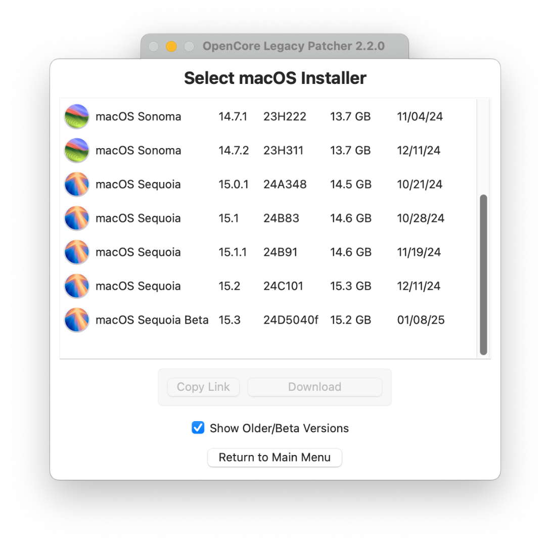 Leider ist da unser OpenCore Legacy Patcher auch nicht viel besser: unter "Create macOS Installer"/"Download macOS Installer"/"Show Older/Beta Versions" steht bei Sonoma zwar immerhin die Version 14.7.2 mit der Nummer 23H311, von der ich mir den Installer-Link kopieren kann, die ist aber von November. Die aktuelle Sequoia-Beta wird dagegen richtig angezeigt mit der aktuellen Nummer.
