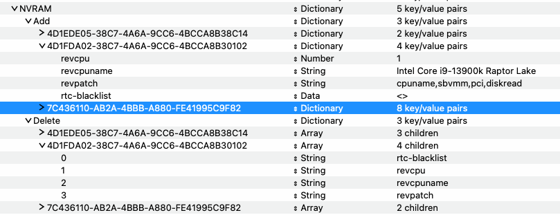 Und unter Delete stehen die Boot-Args bei 7c43.. natürlich an erster Stelle, so wie auch revcpuname bei 4D1FDA....