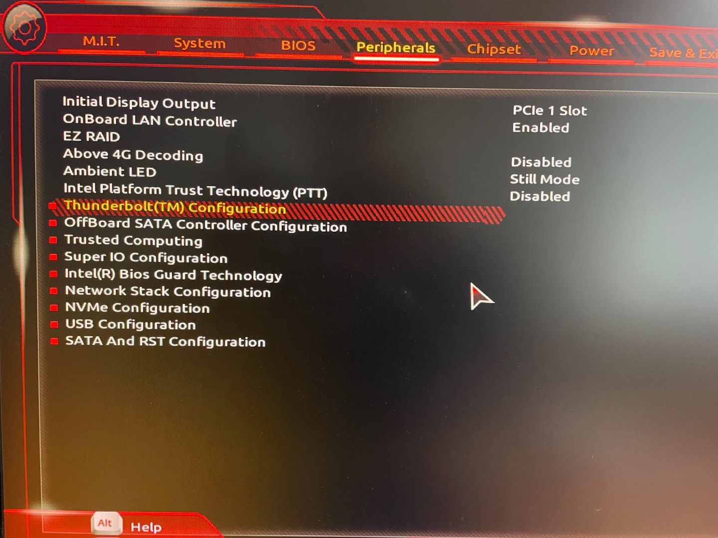 Die Karte wird im BIOS erkannt, nachdem ich sie über den THB-C-Header verbunden habe, sodass ich auch BIOS-Anpassungen vornehmen konnte. Allerdings erscheint sie unter macOS weder im PCI- noch im Thunderbolt-Bereich der Systeminformationen. Unter Windows habe ich die Treiber installiert.