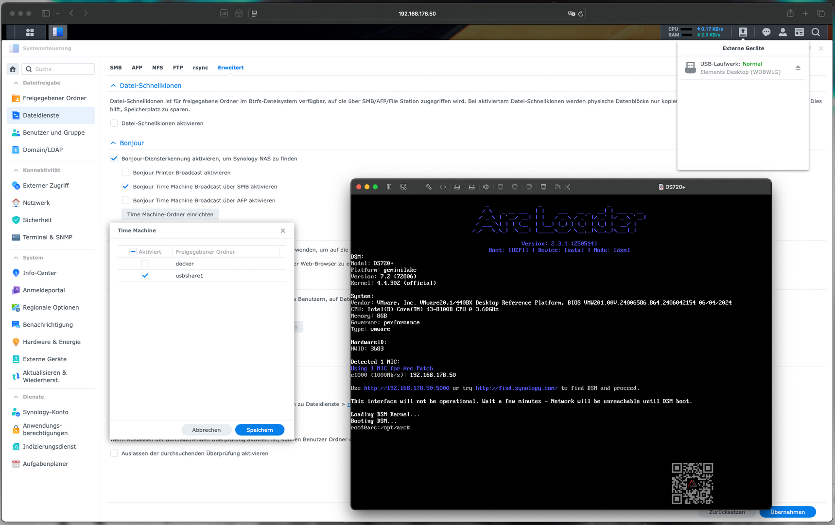 Auf dem Mini 2018 läuft mittels VMWare Fusion 13 (kostenlos) ARC Loader samt Synology DSM7.2 in vollem Umfang.