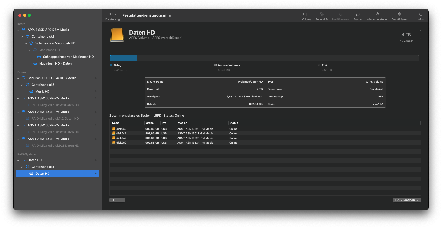An diesem hängt ein DAS (Direct Attached Storage) der Firma TerraMaster (D4-310 Raid-Funktion) mit 4x 1TB SSD´s.