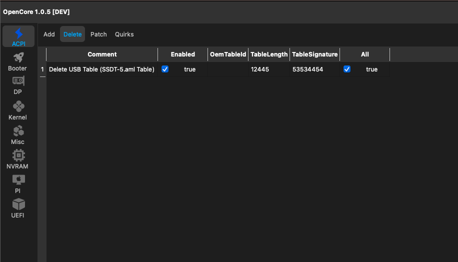 Du machst das Mapping über ACPI mit einer SSDT. Leider sehe ich bei deiner Config keinen Eintrag unter ACPI -> Delete. Da ist alles leer. Damit die geänderte Tabelle ordnungsgemäss geladen wird, muss das Laden der originalen Tabelle unterdrückt werden.