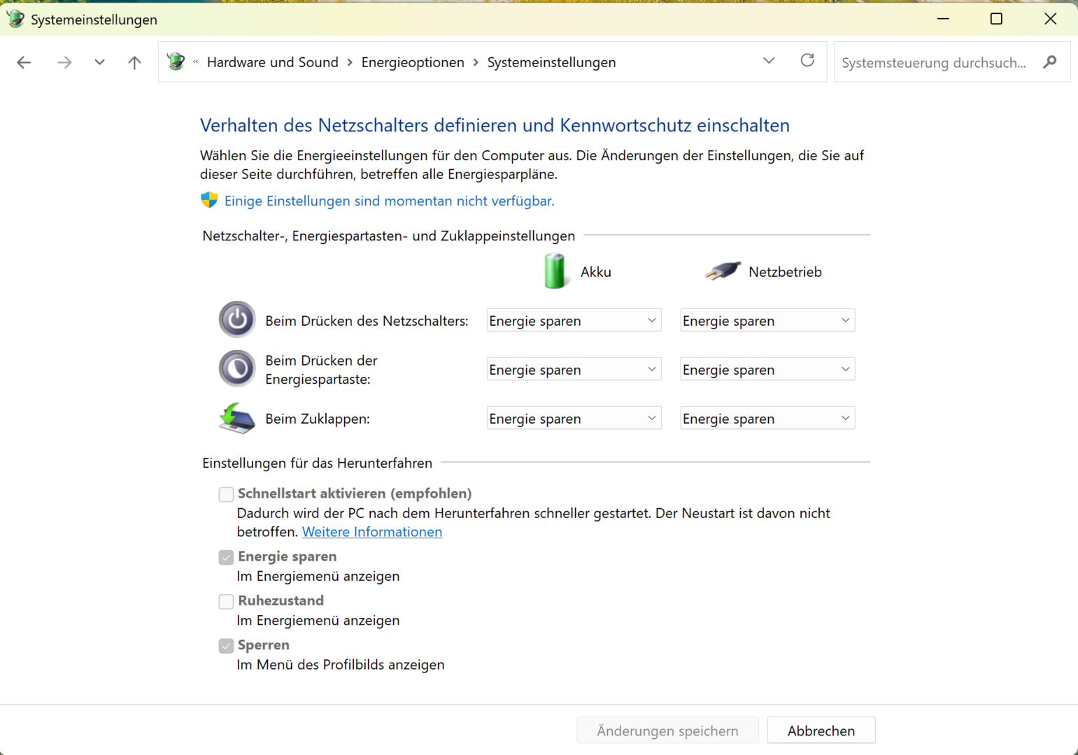 bluebyte Schnellstart habe ich in W11 über den Registry-Editor deaktiviert. In der Systemsteuerung gibt es bei W11 nichts dazu. Wirksamer scheint mir aber Windows mittels gedrückter Shift-Taste herunter zu fahren. Danach dauert der Startvorgang einiges länger als nur mit dem deaktiviertem Schnellstart und die Funktion des deaktiviertem Schnell schränkt das PM unter Windows zusätzlich ein, weil dadurch das Windows-Hybernatfile deaktiviert wird. Jedenfalls hat es zum Powermanagement unter Windows nichts beigetragen. Auch nicht die aktualisierte Lenovo-Firmware zur Energieeinsparung nicht.