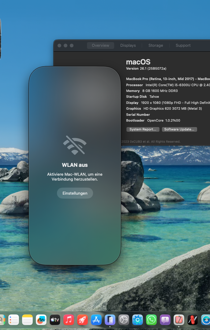 • Die Meldung kommt weil Itlwm keinen Airport Adapter sondern ein LAN bereitstellt. Sollten Modern Wifi Patche für Tahoe verfügbar sein und falls dann damit AirportItlwm Ventura funktioniert, wird die WLAN Meldung sehr wahrscheinlich nicht mehr angezeigt werden - funktionieren wird iPhone Synchronisation aber trotzdem nicht, ist nicht EU Datenschutz konform.