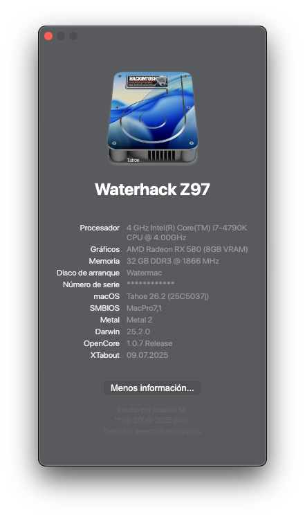 Hackintosh System Gigabyte C246M-WU4 Motherboard, 128GB ECC Speicher, Intel Xeon E-2276G, Sapphire AMD 6600XT Grafikkarte - macOS 26.4.1 (25E253) OC 1.0.7