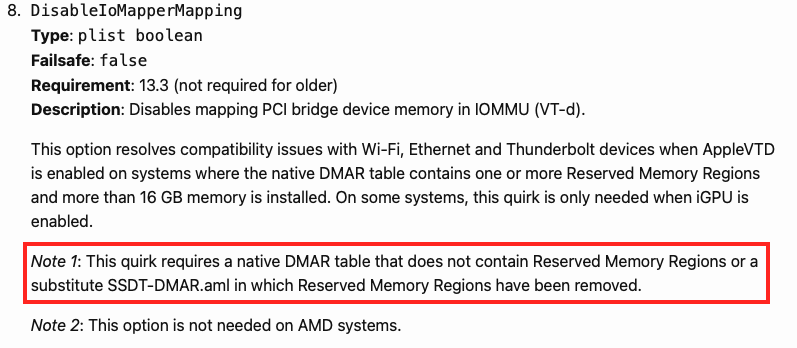 Eventuell kann es reichen, nur den Kernel Quirk auszuschalten - aber kann gut sein, dass du DMAR patchen musst (oder teilweise). Falls du es nur versuchen willst, EFI auf einen Stick und von dem Booten - deaktiviertes DisableIoMapper kann auch eine Panic zur Folge haben, falls macOS mit den vorhandenen DMA Reservierungen aneinander gerät (daher Dortania's Ansatz, die vorhandenen DMA Reservierungen zu entfernen - kann sich btw. auch ungünstig auswirken).