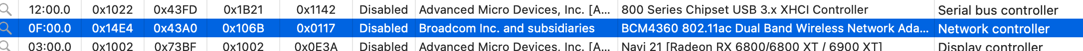 AirportItlwm (Ventura) konnte ich an einem Testgerät ebenfalls zum Laufen kriegen (mit der bekannten Broadcom Fake Device Methode) - so sieht das aus (Device Path muss natürlich angepasst werden):