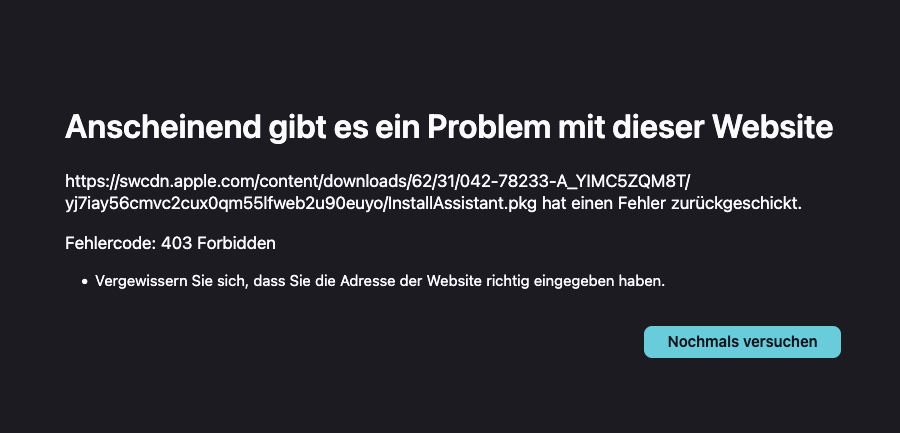 eingegeben, und siehe da: auffällig viele macOS Versionen wurden auf dem Apple Server gelöscht, u.a. natürlich auch die 14.3.1, die bei ihm noch problemlos ging.