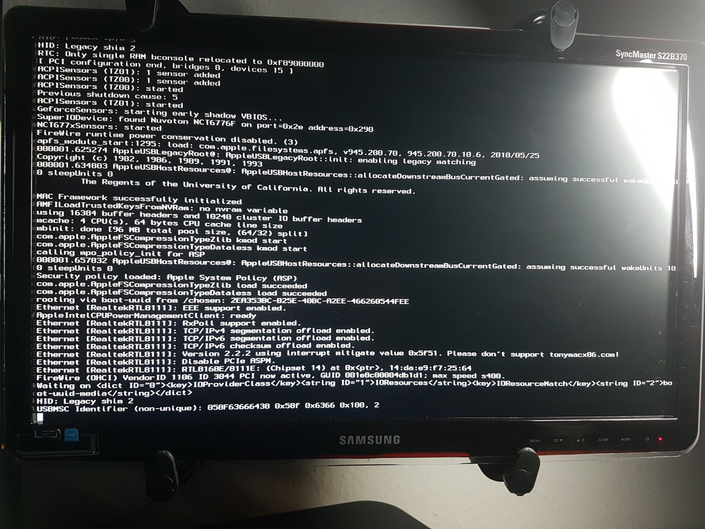 SSD: 256GBMit meinem aktuellen EFI Ordner komme ich bis zum Apfel (der Bootvorgang im verbose Mode ist dann bereits fertig). Dann komme ich auf einen "Apple Desktop" Mit einem knapp 500 Zeilen langen Fehlerbericht, welchen ich leider nicht speichern kann, da mir angeblich die Berechtigung dafür fehlt?!
