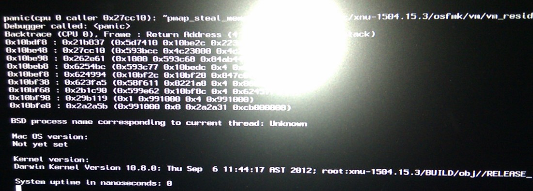 Habe also von iBoot Ivy Bridge 1.1.0 CD gebootet und dann die MAC OS Setup CD reingetan. Als Parameter habe ich direkt PCIRootUID=0 -v -x mitgegeben. Das läuft dann gut 5 Minuten, bis es einen Kernel Panic gibt (siehe Bild im Anhang).