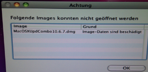 Ich habe mir von der Apple Seite das SL Update 10.6.7 und 10.6.8 heruntergeladen. Das sind .dmg Dateien. Also habe ich diese Dateien per USB in mein "Mac" gebracht" und wollte einfach per Doppelklick installieren, wie man es aus Windows kennt. Dann kommt aber direkt die Fehlermeldung das die Image Datei beschädigt sei (bei beiden Updates). Also habe ich die Dateien nochmal von anderem Browser / PC heruntergeladen und wieder dassselb ![]()