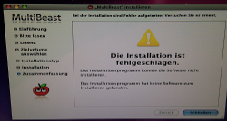 Gleiches merkwürdiges Verhalten dann in Multibeast. Ich wollte mit Multibeast verschiedene Driver usw. installieren, dann komm auch eine Meldung das die Installation nicht gestartet werden kann, bzw. das die Installation keine Software zum installieren gefunden hat.