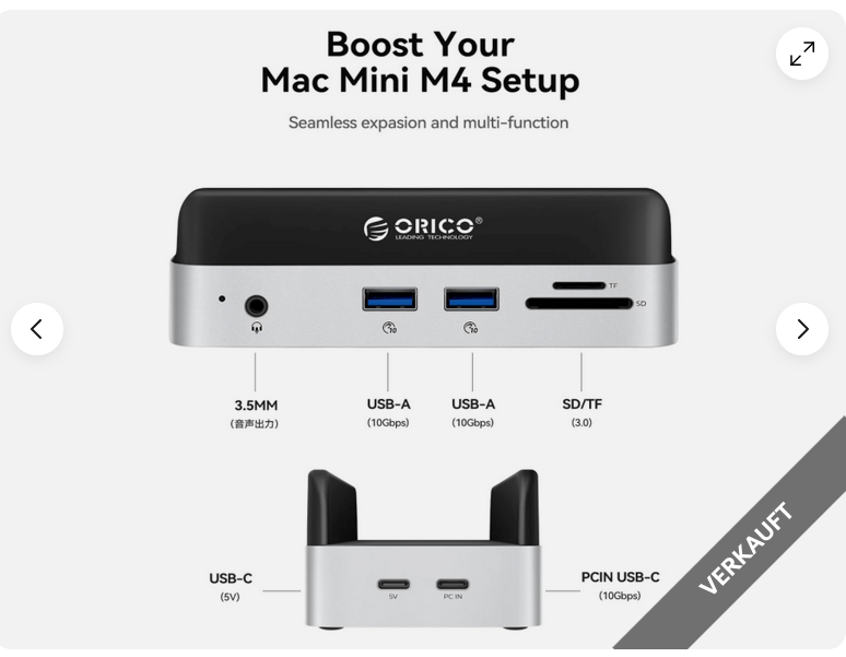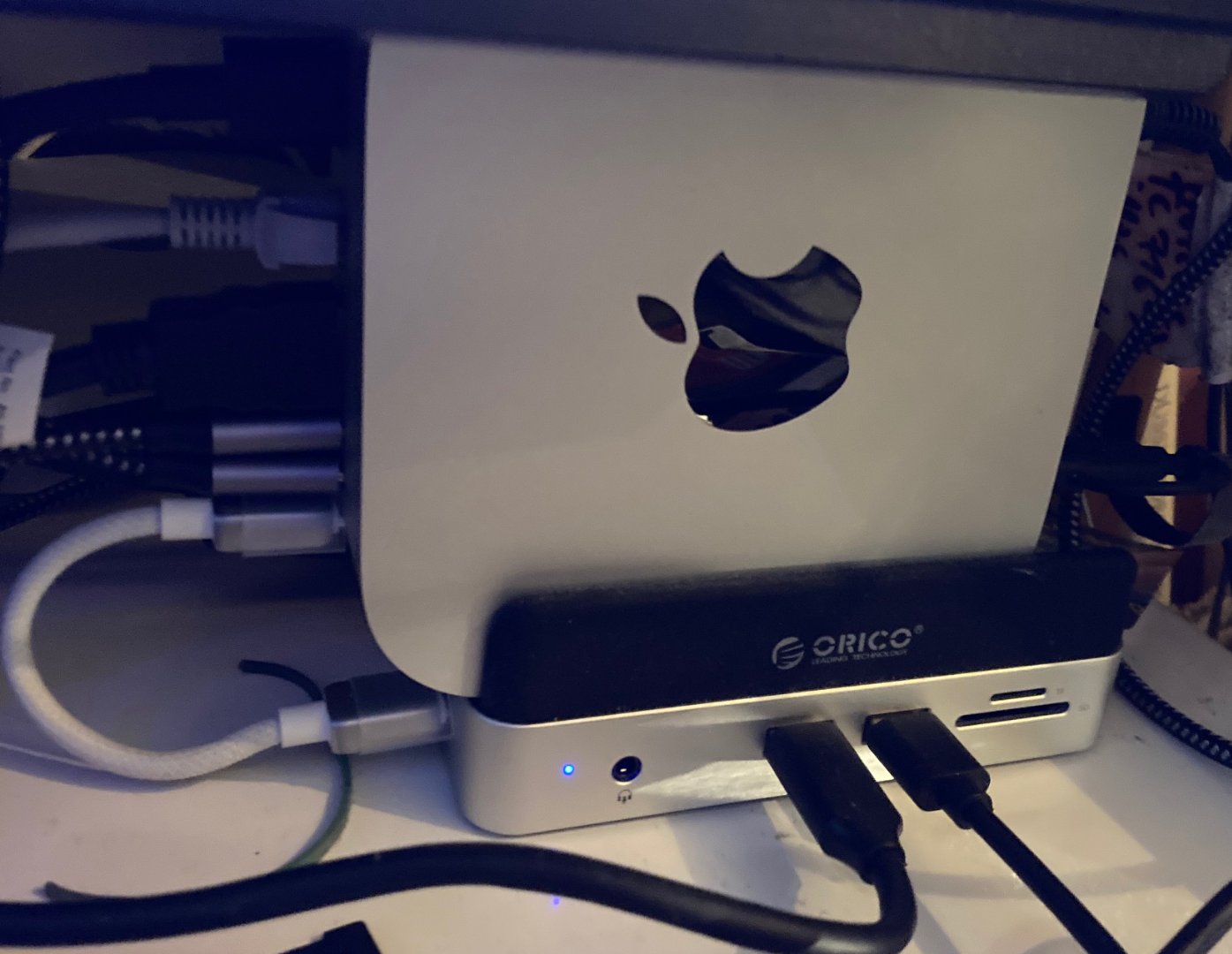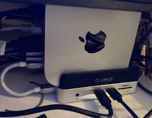 Das wiederum ist über den Orico Hub mit USB-A und von dort mit USB-C (Thunderbolt) an den MacMini angeschlossen.