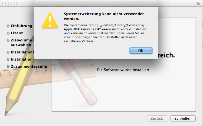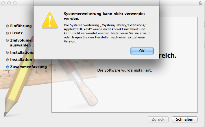 Mit dem Ergebnis, dass ich jetzt 5 Kext-Nicht-Installations-Meldungen bekomme statt drei, wenn ich versuche, den Canon-Druckertreiber zu installieren.