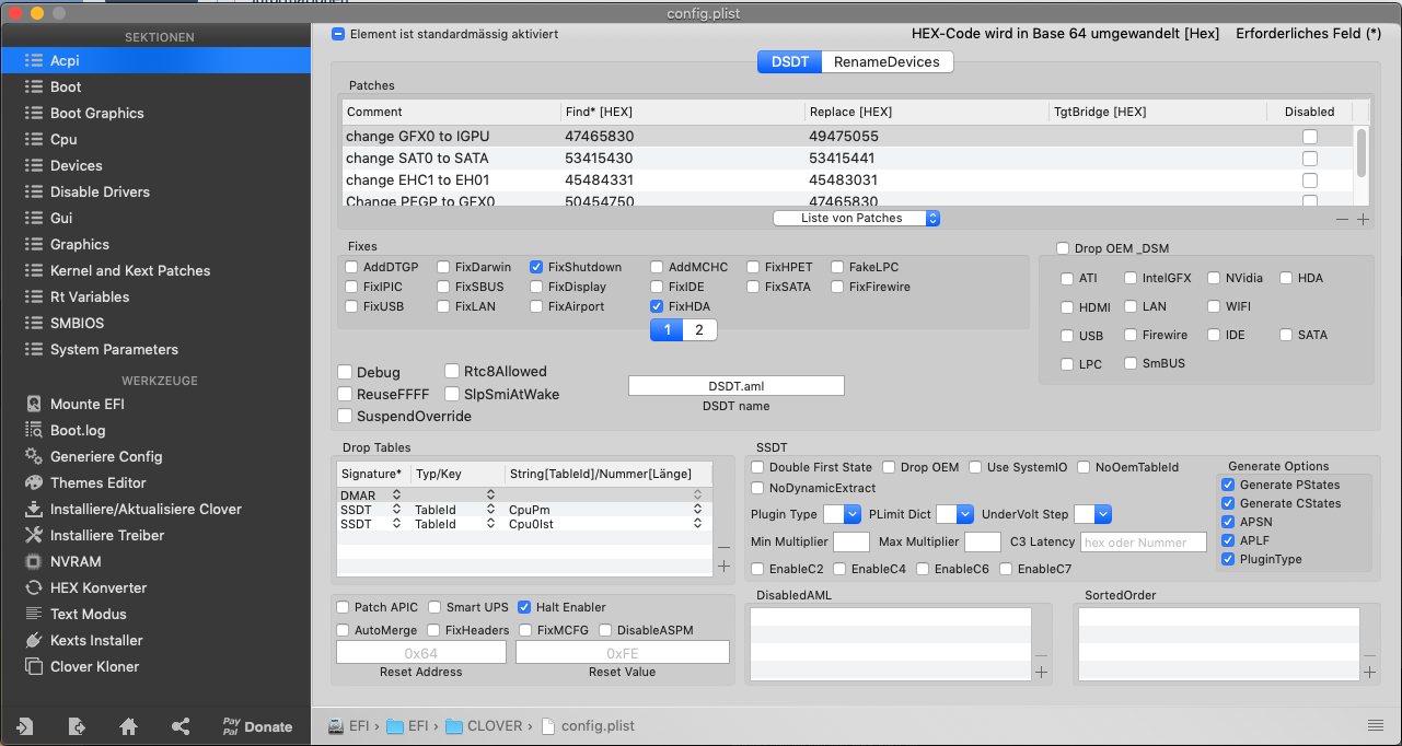 Ich habe die EFI-Vorlagen von al6042 für CLOVER-CFL verwendet. Gehe ich hier richtig in der Annahme, dass man den gewünschten Eintrag auf config.plist umbenennt.