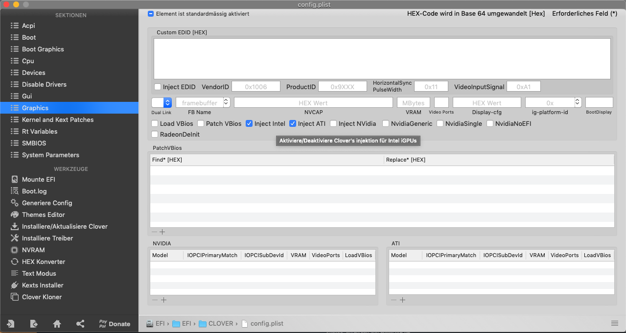 Im Clover ist folgendes ausgewählt: Inject ATI, Inject Intel