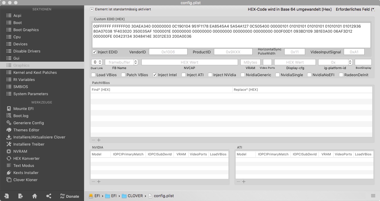 In Clover muss natürlich die EDID injected werden (evtl. das Feld "custom-edid" leer lassen, falls Clover sich automatisch die richtige EDID holt). Wichtig: Dual-Link=1 ab 1600x900 aufwärts.