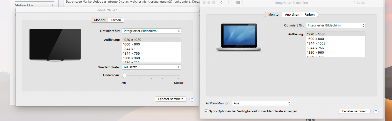 Externes Display funktioniert wie gesagt einwandfrei mit FHD-Auflösung. Das interne Display ist auch an (Hintergrundbeleuchtung, jedoch BlackScreen). In MacOS wird es als internes auch korrekterweise erkannt (mit richtiger Auflösung), jedoch wird wie gesagt nicht angezeigt. Sieht dann so aus im OS: