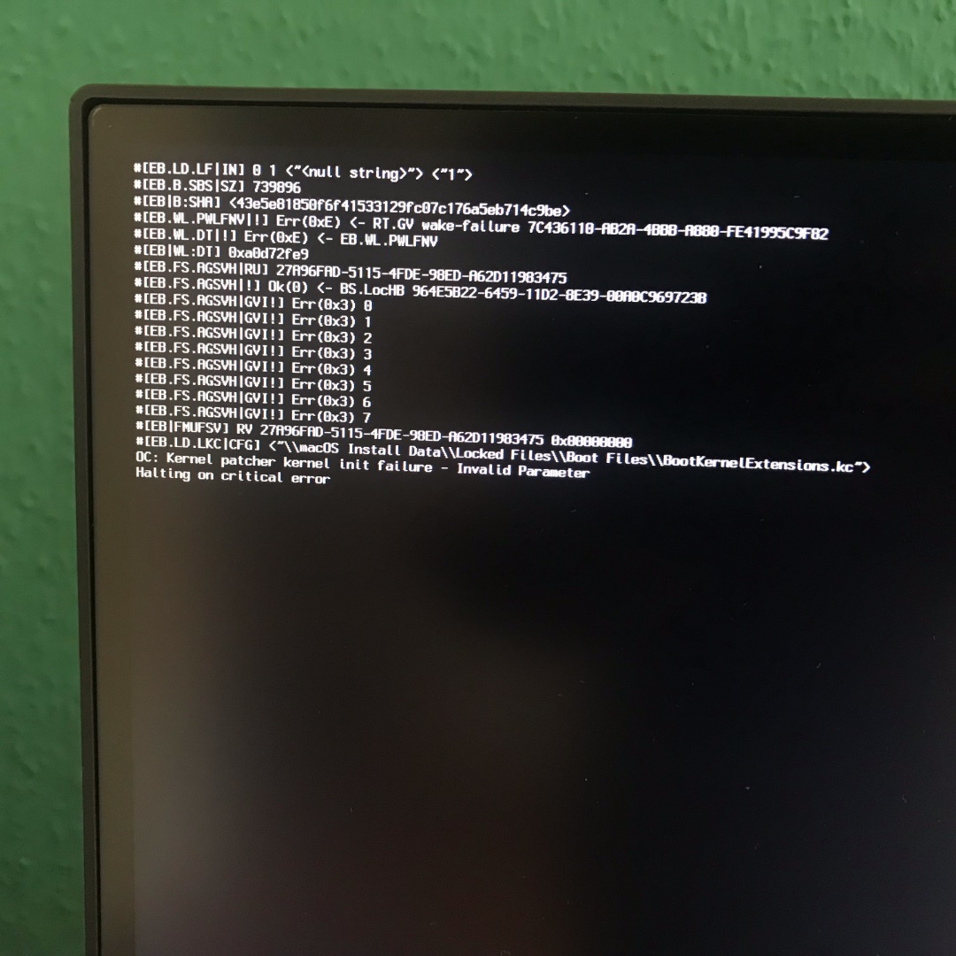 Mit der in diesem Thread hochgeladenen EFI von plutect startet der Installer (Big Sur Cleaninstall) sehr schnell und scheint gut durchzulaufen, hängt dann leider irgendwann beim 2. Reboot nach der Installation mit dem auf dem Foto sichtbaren Fehler.