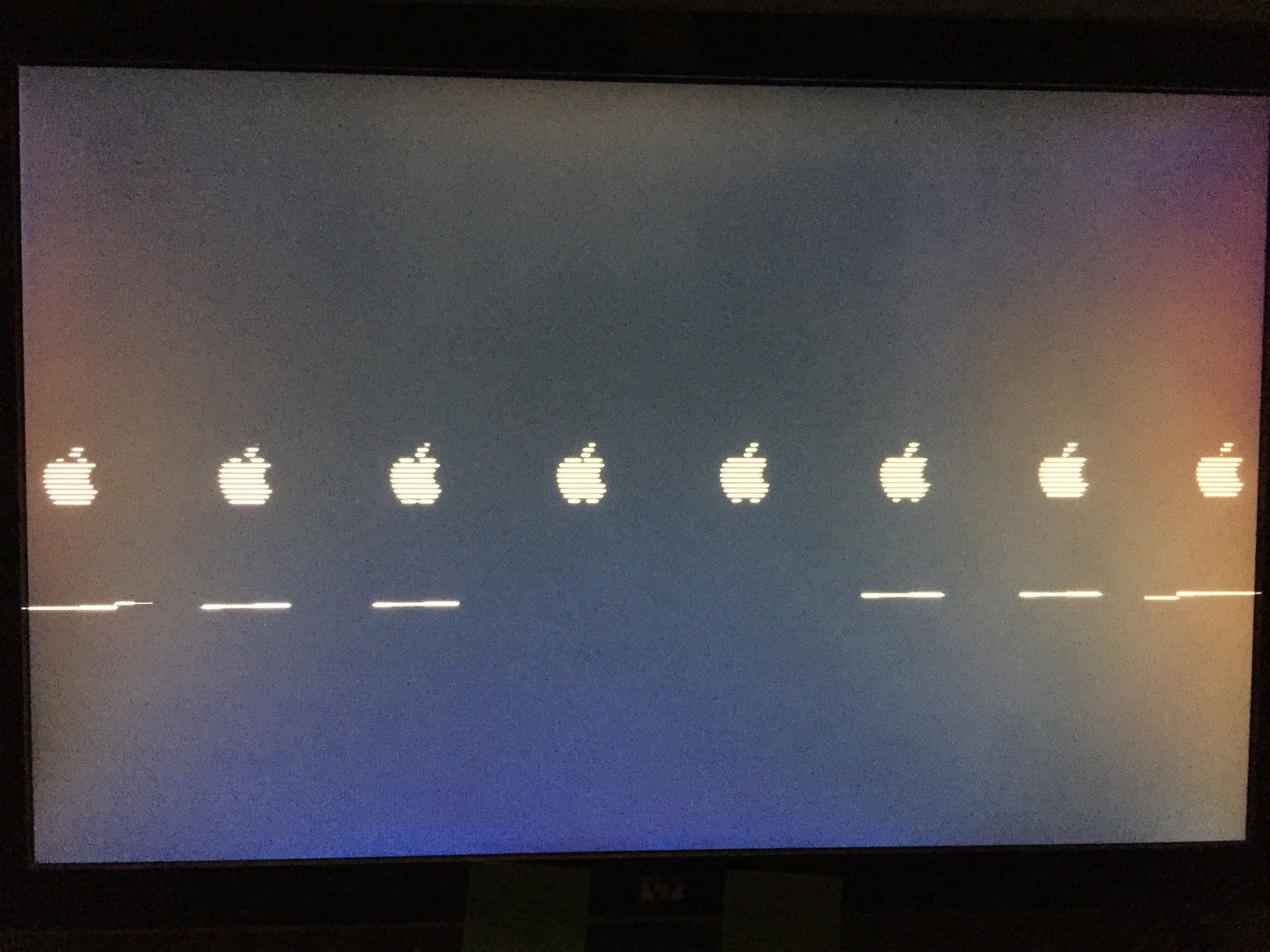 dann startet der Rechner neu, ich wähle im Bootmenü den USB-Stick aus, derschwarze Bilschorm mit dem weißen Ladebalken braucht ewig und dann kommt ein total verzerrtes Bild (Anhang)