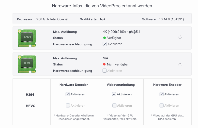 iMac pro 1,1 ist eingestellt. VideoProc habe ich probiert, nutzt nur die CPU. Neben Final Cut habe ich die gleiche Fehlermeldung in Motion.