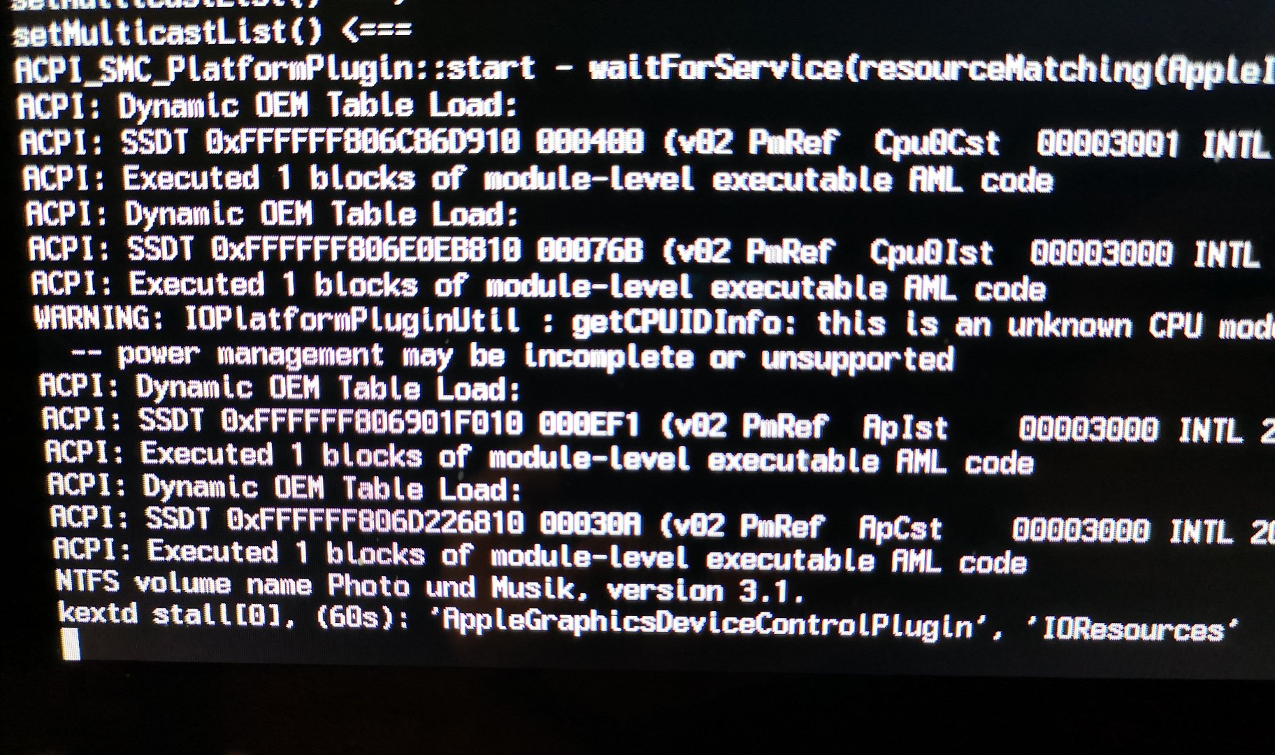 Ich habe watchdog=0 gesetzt und den Kext für den Sound mal rausgenommen, dann kommt das :