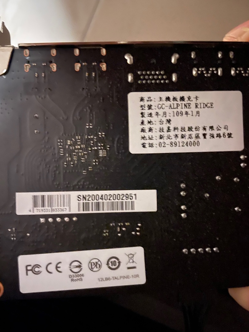 Ob ich sicher sein kann kann ich eben nicht zu 100% sagen, da ich sie nicht zum laufen bring. Ich habe sie auf Kleinanzeigen erworben. Aber bisher kam ich mit Karte und den Schritten hier mehr voran. Mit dem Einbau der Karte hatte ich zum ersten Thunderbolt Settings im BIOS. Nachdem ich die DTPG im EFI hatte erscheint zum ersten mal was in den Systemeinstellungen. Das wirkt schon vielversprechend.