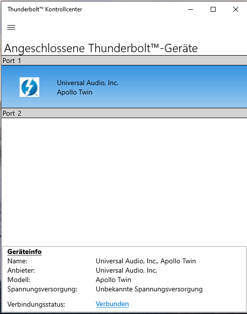 Das Thunderbolt Kontrollcenter zeigt nach wie vor nichts an. So auch die UAD Software.