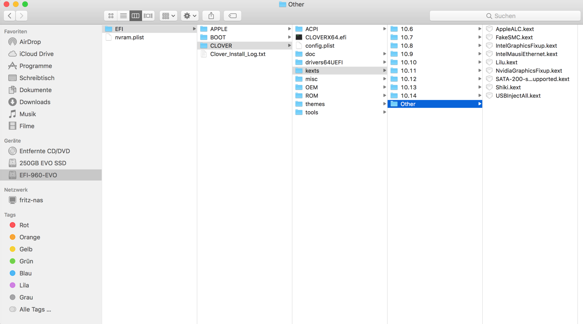 Also ich habe nun einzeln mounten lassen die SSD's und nur die EVO 960 hat ein Clover Ordner die anderen beiden haben zwar einen Ordner Namens EFI aber ich sehe kein Clover darin.