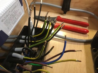 Inzwischen ist die "Nabelschnur" tatsächlich an der Decke verlegt, wenn dort auch noch die Rollwagen und Führungsschiene fehlen.