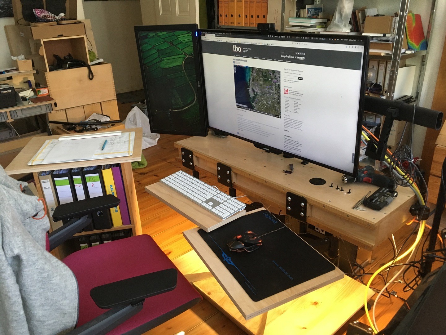 Der dritte Monitor ist ein Cintiq an einem Monitorarm, den man sich über/neben die Tastatur ziehen kann.