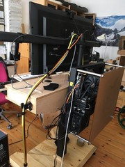 Stromzufuhr und Datenkabel, Audio, etc. laufen gebündelt an die Zimemrdecke und dann zur Seite weg wo weitere Pereferiegeräte stehen (Scanner, Drucker, Sicherungslaufwerk, NAS).