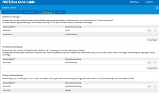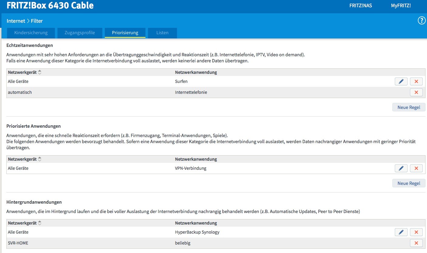 - Fritzbox 6430 Cable (hier habe ich schon Priorisierung eingetragen, hat aber nichts gebracht. Ich bin mir auch nicht sicher, ob ich die richtigen Ports verwendet habe. Also habe ich sogar das komplette NAS (NAS-HOME) als Hintergrundanwendung in der Fritzbox eingetragen - jedoch noch immer mit dem gleichen Ergebnis