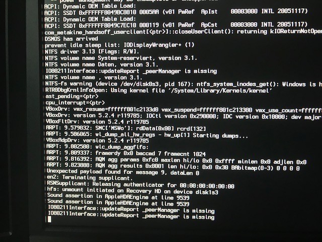 Nach dem Neustart ist der Mac nicht mehr hochgefahren. Also habe ich mit -s gebootet und im Terminal die beiden kexte wieder gelöscht.