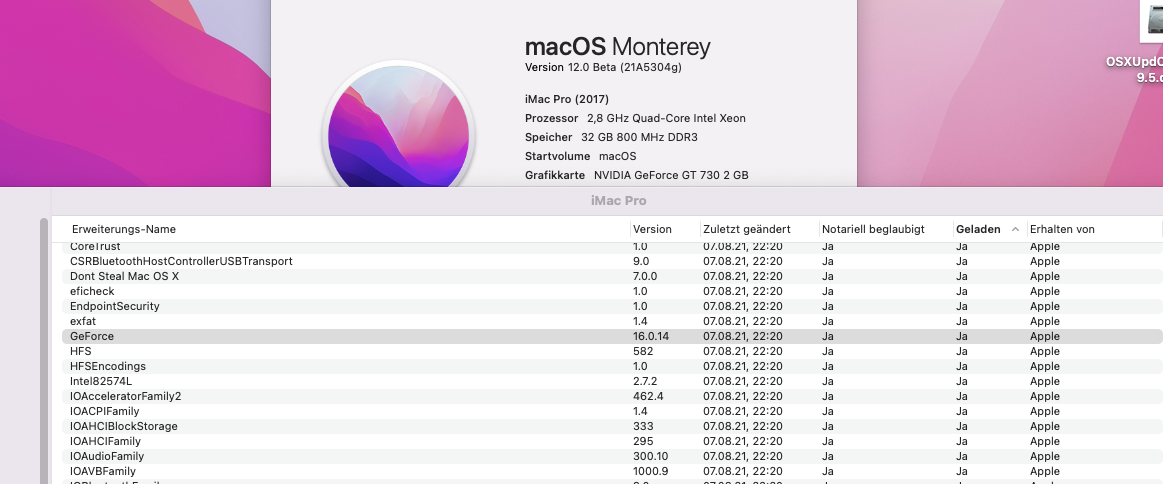 #MacPeet: Hm, danke für die Info. Auf meinem anderen Intel-Server, einem Fujitsu Primergy TX150 S7 scheint die gleiche GraKa aber unter Monterey zu funktionieren. Dort ist sie mit 2 GB drin und Treiber wird geladen. Kann allerdings damit zusammenhängen, daß ich dort das Montery als Beta draufhabe (seinerzeit geupdatet von Catalina, welches ich wohl zu dem Zeitpunkt auch gerade als Beta zur Hand hatte). Kannst du das bestätigen, daß die Nvidia-Kext's bei der Beta noch drin waren?
