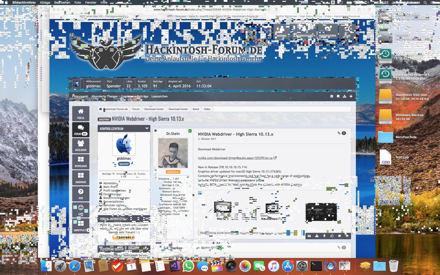 Seit dem Upgrade auf High Sierra bekomme ich nach einer Weile Grafikprobleme. Das äußert sich in Blöcken, die Rauschen enthalten (siehe Anhang).
