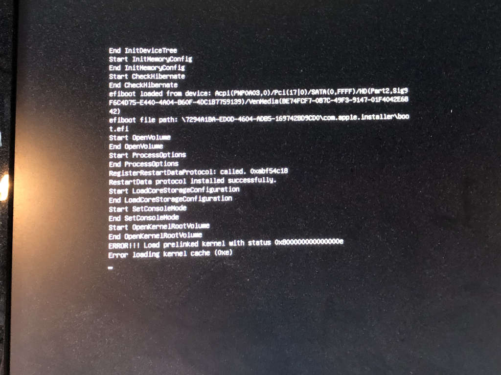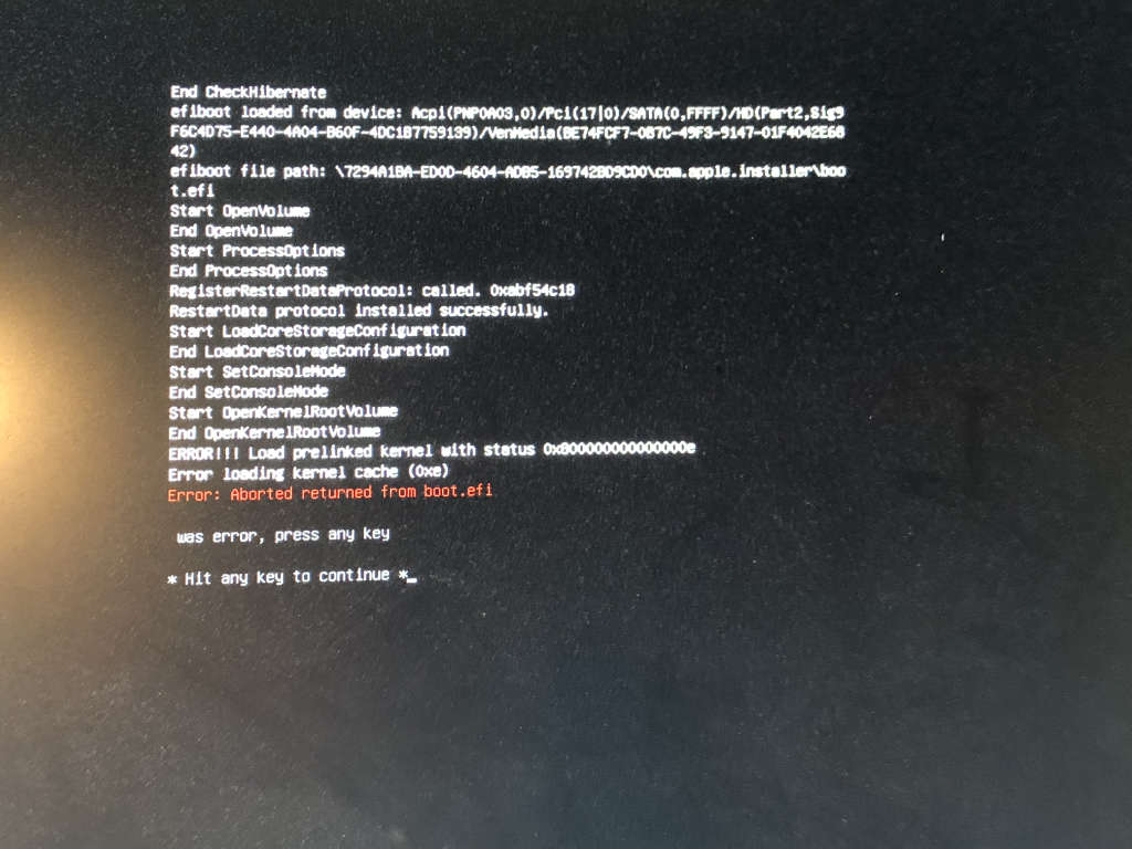Nach dem ersten Restart über „Boot macOS Install Prebooter from Preboot“ wurde Catalina installiert, ein weiterer Restart, wieder über „Boot macOS Install Prebooter from Preboot“ lieferte aber folgende Meldung: