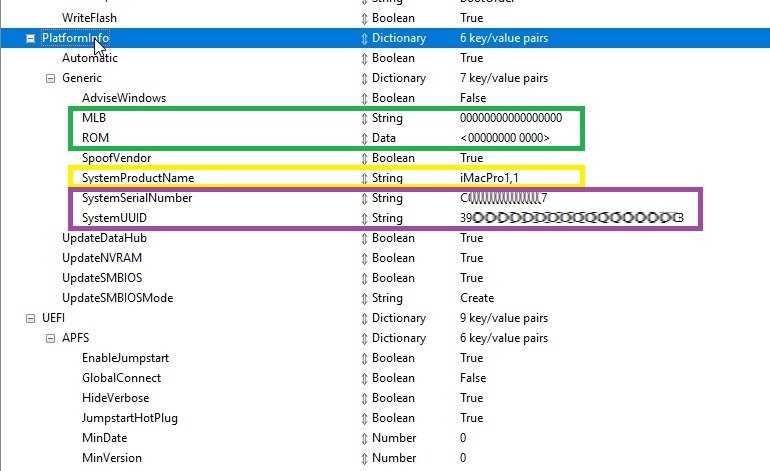 Nun bin ich bei der Plist-Anpassung mit ProperTree-master angekommen, die ich verstehen will. Hier möchte ich mich auch mal von Anfang an versuchen und lernen, wie Änderungen/Anpassungen vorgenommen werden. Eine Seriennummer, Board-SN, ID und ROM-Adresse habe ich mir kürzlich auch generiert.