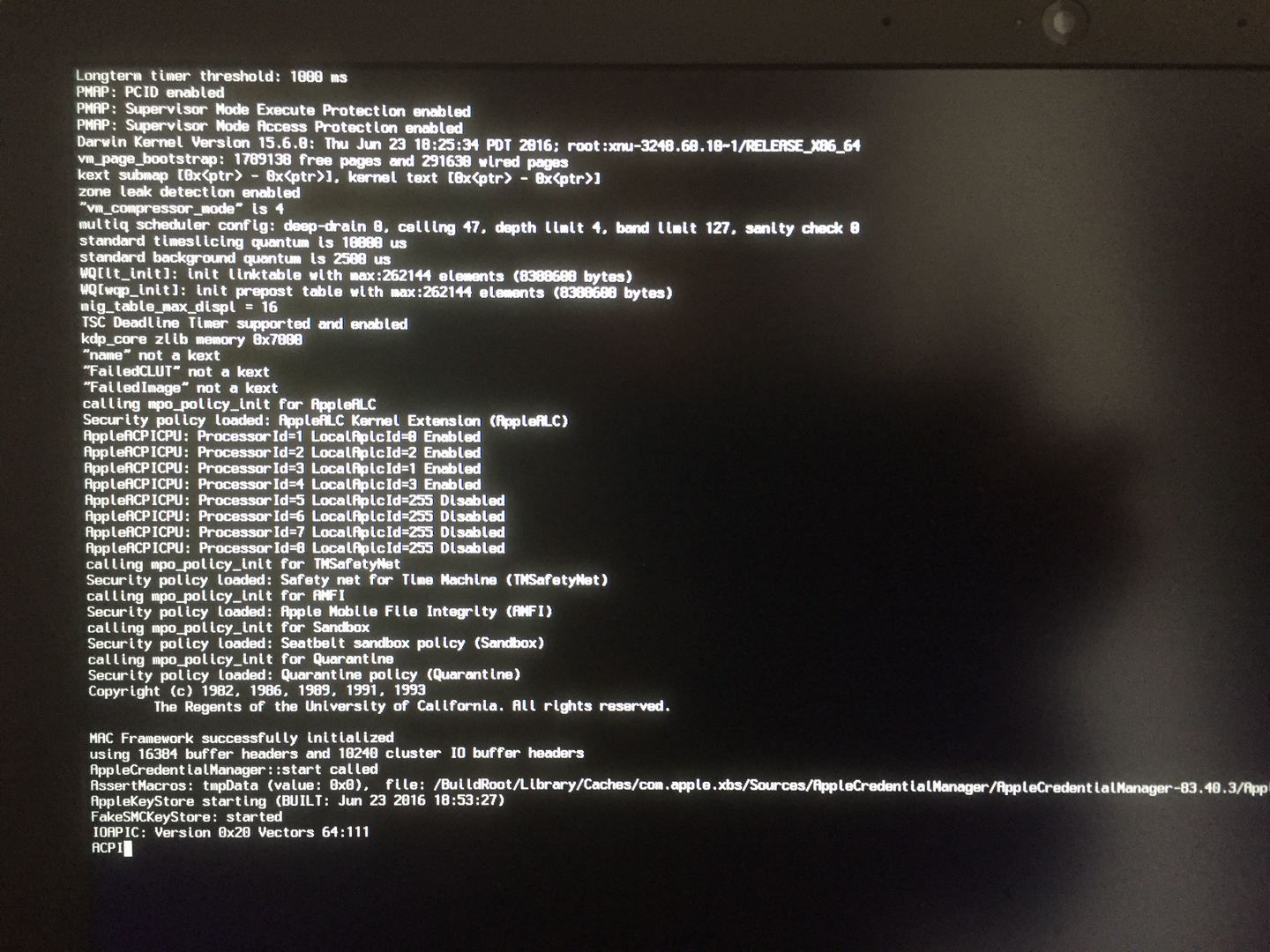 So, nun ist es raus: der Übeltäter heißt FakeSMC_CPUSensors! Mit diesem bleibt er bei ACPI im Bootvorgang hängen.