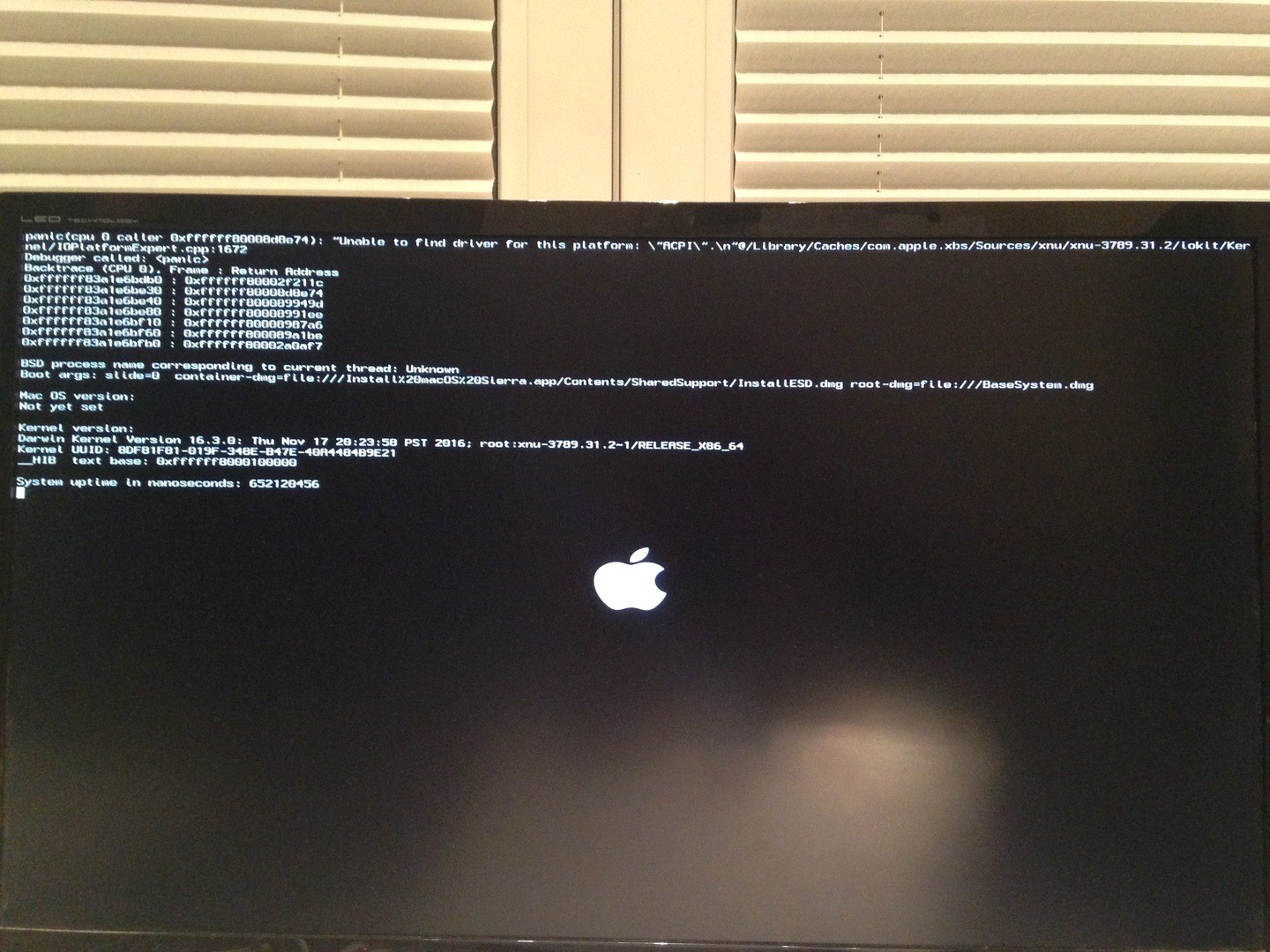 Wenn ich es ohne -v probiere, kommt kurz der Apfel, allerdings verzerrt wahrscheinlich 1280x1024px. Anschließend genauso die Kernelpanic.Ich habe jetzt gelesen, dass El Capitan sehr anfällig ist, was die Häkchen bei "Acpi" und bei den "USB Devices" angeht. Gilt das auch für Sierra, sodass man da alles rausnehmen sollte?