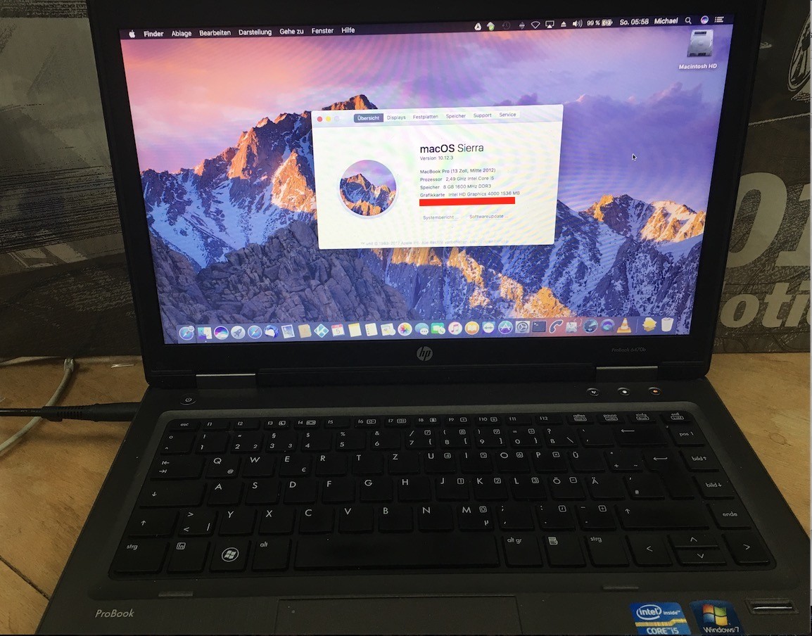 Das HP Probook ist ca. 4 Jahre alt und mit der integierten Intel HD 4000 Grafikkarte bestens geeignet für Sierra. Es hat eine 1366x768 Auflösung mit einem Display von 14“. Mit der originalen Wlan Karte bekam ich zuerst kein Wlan angezeigt. Dank @wl_michael hier aus dem Forum bekam ich den Tip mir die BroadCom BCM943224HMS aus der Bucht zu kaufen.