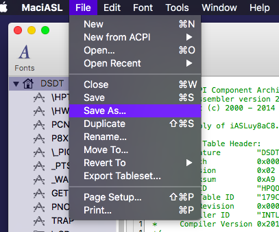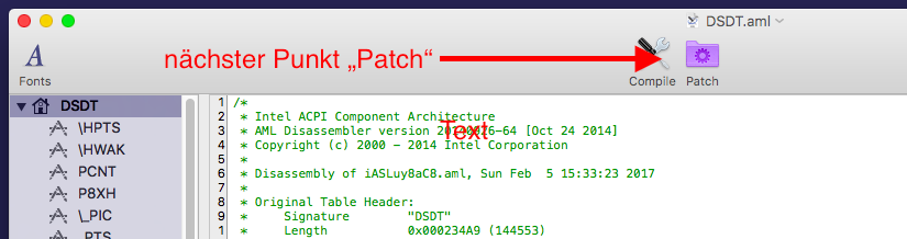 Nun die zuvor erstellte originale DSDT.aml zum bearbeiten mit MaciASL öffnen.
