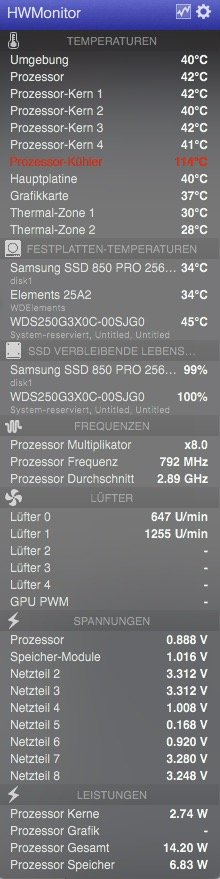 FakeSMC funktioniert seit... nicht. Hab ich auch oben beschrieben. Egal, welcher HWMonitor-App ich für das Auslesen nehme. Nein, auch nicht mit den extra Kexten aus dem Ordner den es zur SMC2x App dazugibt. Lassen wir das Thema einfach.