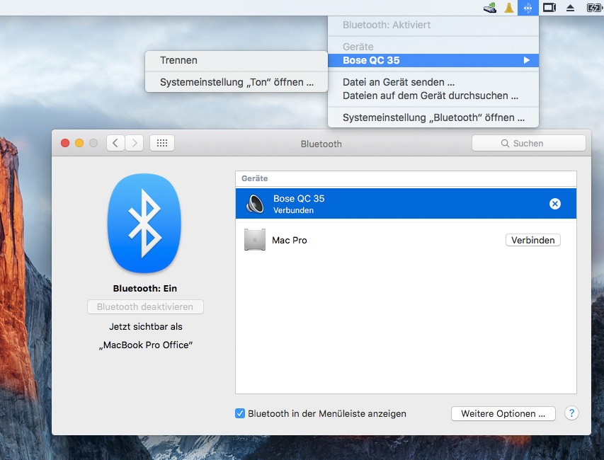 1. Bluetooth: Da stimmt etwas nicht. Es ist vorhanden, aber der Button "Bluetooth deaktivieren" ist grau, kann nicht angeklickt werden und es findet keine Suche mehr statt. Das Rädchen oben rechts erscheint nicht und sucht. Auch kann ich den Eintrag der vorhanden ist nicht per rechter Maustaste anwählen.