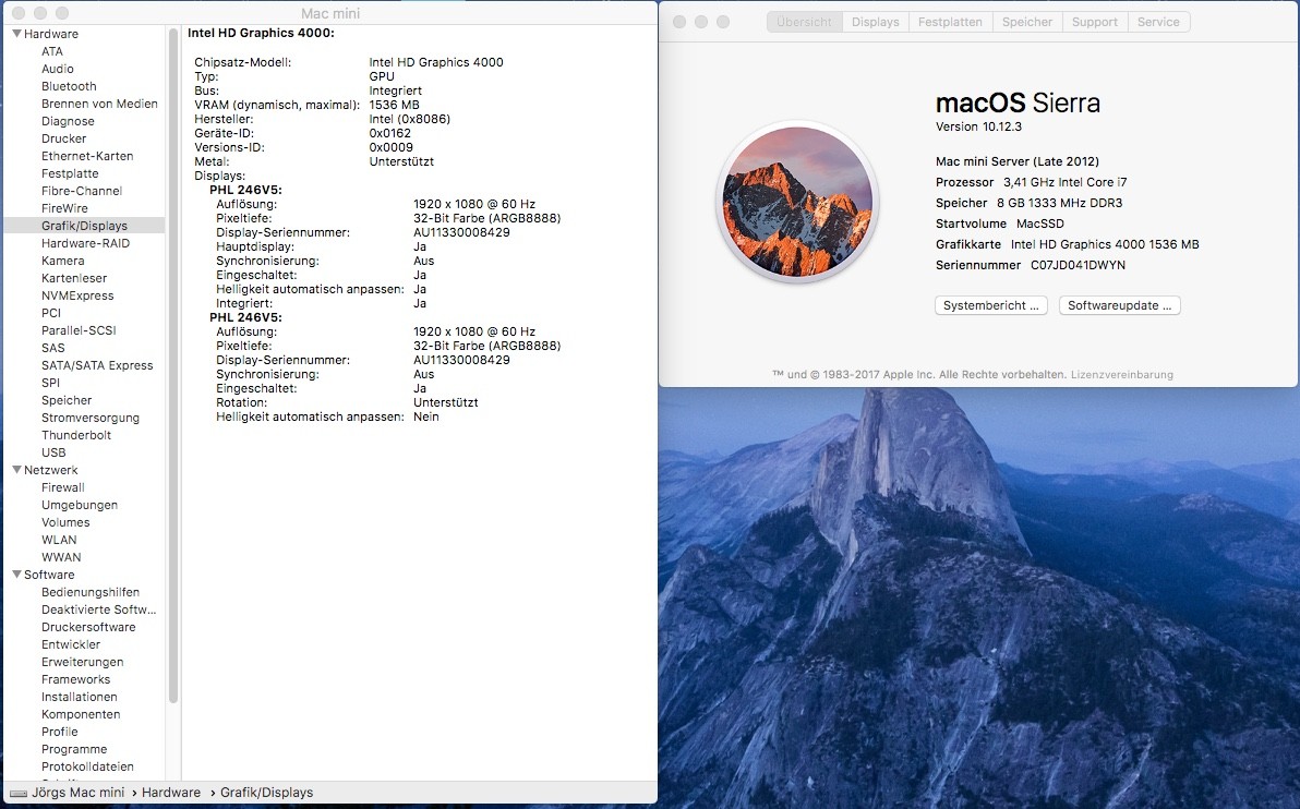 Die Monitore haben die gleiche Auflösung, in den Systemeinstellungen erkennt OSX aber den gleichen Monitor (Phillips 246V5) zweimal, vielleicht, weil ich zweiten bei der Installation (Samsung SD330) noch nicht hatte.