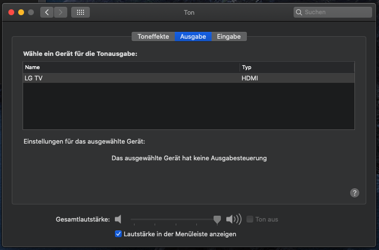 EDIT2: Was auch nicht hinhaut ist die Funktion "Lautstärke in der Menüleiste anzeigen" Der kleine Lautsprecher ist grau und wenn man draufklickt wird kein Ausgabegerät angezeigt und der Lautstärkeschieber ist auch grau. Wenn ich aber über die Systemeinstellungen gehe wird mir der TV (HDMI) angezeigt und es ist auch was zu hören ?!?